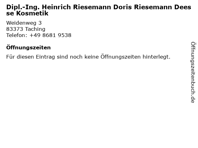 | Dipl.-Ing. Heinrich Riesemann Doris Riesemann Deesse Kosmetik anrufen | |