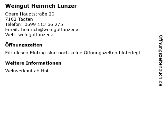 | Öffnungszeiten Weingut Heinrich Lunzer in Tadten anzeigen | |