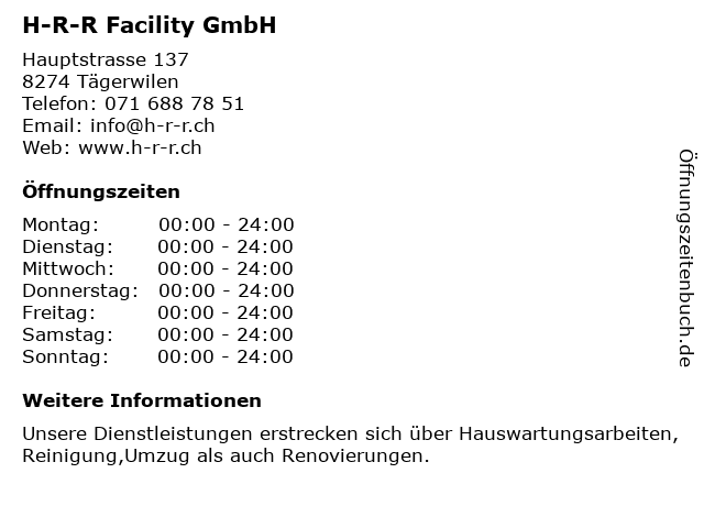 | Öffnungszeiten H-R-R Facility GmbH in Tägerwilen anzeigen | |