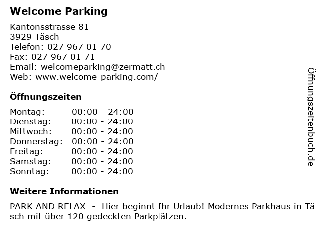 | Öffnungszeiten Welcome Parking in Täsch anzeigen | |
