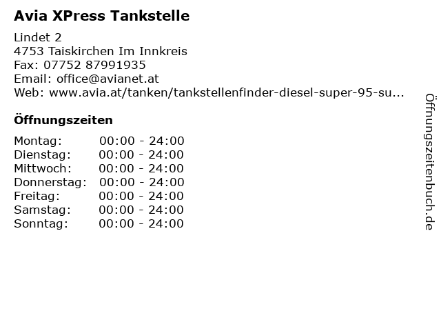 | Öffnungszeiten Avia XPress Tankstelle in Taiskirchen Im Innkreis anzeigen | |