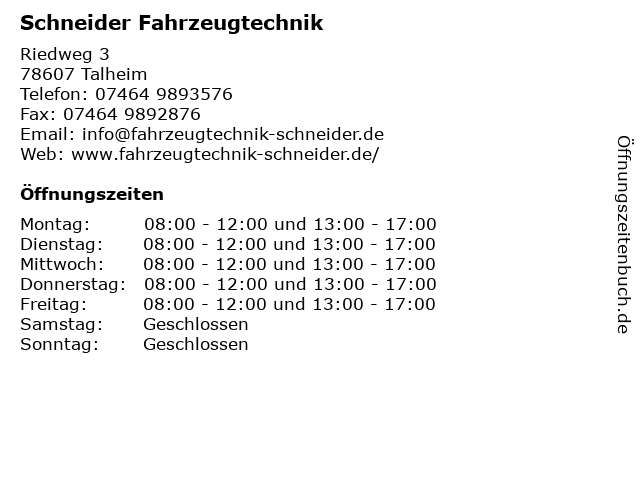 | Öffnungszeiten Schneider Fahrzeugtechnik in Talheim anzeigen | |