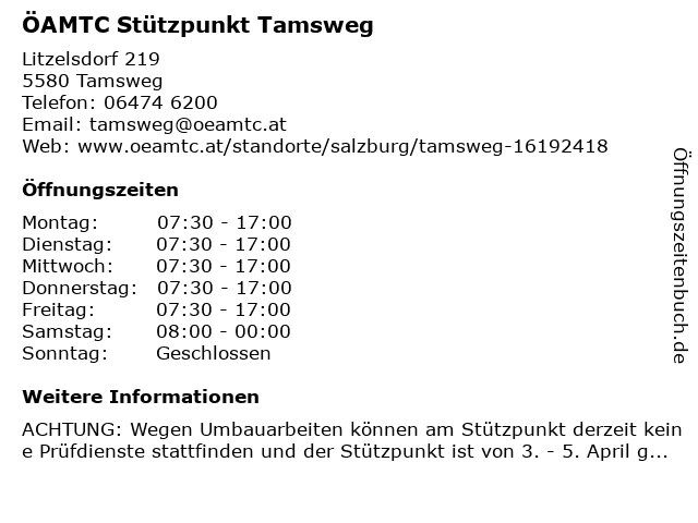 | Öffnungszeiten ÖAMTC Stützpunkt Tamsweg in Tamsweg anzeigen | |