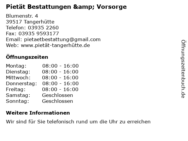 2 Bestattungsring Tag und Nacht, Dorothea Spanka (Entfernung: 0,11 km) Bismarckstr. 17, 39517 Tangerhütte 4 Christian Gräser Bestattungen - Grabmale - Tischlerei (Entfernung: 23,11 km) Dorfstr. 21, 39576 Stendal 6 |