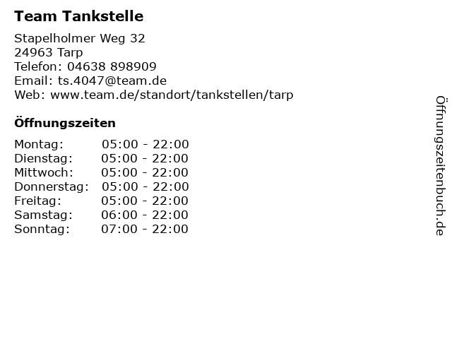| Öffnungszeiten Team Tankstelle in Tarp anzeigen | |