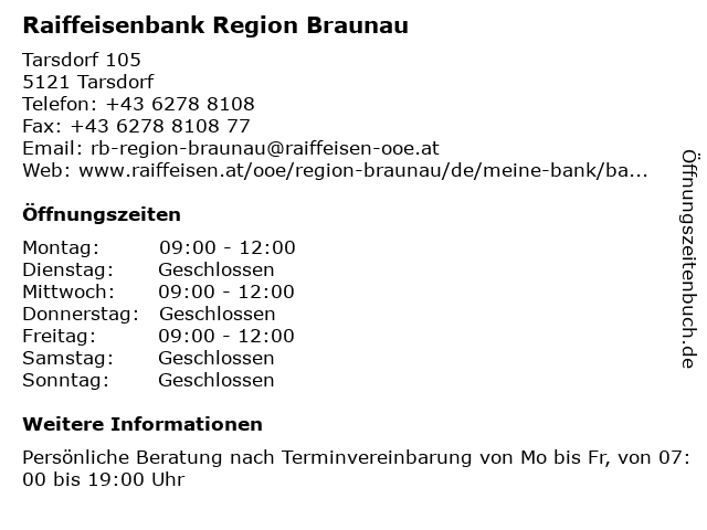 1 Raiffeisenbank Region Braunau - (Bankomat Bankstelle) (Entfernung: 0,00 km) Tarsdorf 105, 5121 Tarsdorf 2 Raiffeisenbank Region Braunau - Bankstelle St Radegund (Entfernung: 5,15 km) St. Radegund 5 a, 5121 St. Radegund 4 Raiffeisenbank Region Braunau - (Bankomat Bankstelle) (Entfernung: 8,36 km) Oberkriebach 59, 5122 Ach 5 BEZIRKSABFALLVERBAND BRAUNAU (ASZ: Hochburg/Ach) (Entfernung: 9,12 km) Athalerstraße 20, 5122 Hochburg/Ach 6 Bezirksabfallverband Braunau (ASZ: Eggelsberg) (Entfernung: 12,50 km) Gundertshausen -, 5142 Eggelsberg |