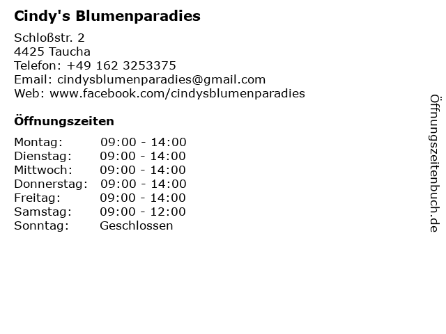 | Öffnungszeiten Cindy's Blumenparadies in Taucha anzeigen | |