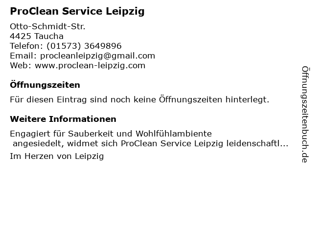 | Öffnungszeiten ProClean Service Leipzig in Taucha anzeigen | |