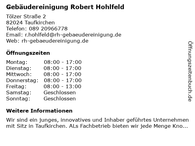 2 Steuerungstechnik Gerätebau Inh. Robert Friedrich (Entfernung: 0,72 km) Tölzer Str. 46a, 82024 Taufkirchen 3 Robert Haas, Lydia Glas- und Treppenreinigung Dienstleistungen (Entfernung: 0,79 km) Akeleistr. 24, 82024 Taufkirchen 6 |