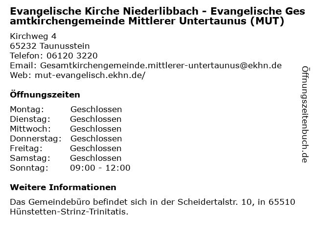 Branchen & Suchbegriffe zu Evangelische Kirche Niederlibbach - Evangelische Gesamtkirchengemeinde Mittlerer Untertaunus (MUT):evangelische, gesamtkirchengemeinde, kirche, mittlerer, mut, niederlibbach, untertaunus |