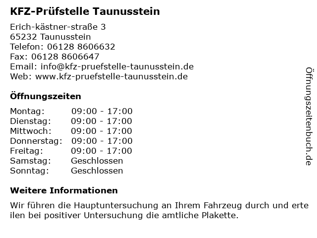 1 Kfz-Prüfstelle Taunusstein Ingenieurbüro Keßler (Entfernung: 0,02 km) Erich-Kästner-Str. 3, 65232 Taunusstein 6 |