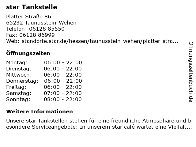 | Öffnungszeiten star Tankstelle in Taunusstein-Wehen anzeigen | |