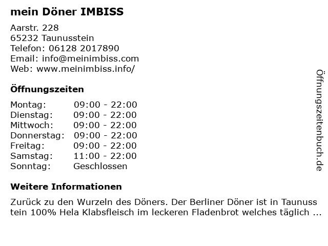 | Öffnungszeiten mein Döner IMBISS in Taunusstein anzeigen | |