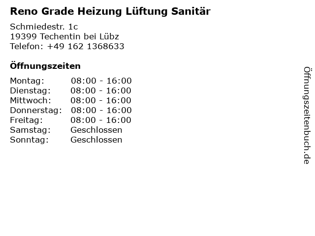 1 Gerd Grade Heizung & Sanitär GmbH & Co. KG - Geschäftszeiten (Entfernung: 0,26 km) Crivitzer Chaussee 45 A, 19399 Techentin 2 Gerd Grade Heizung & Sanitär GmbH & Co. KG - Bürozeiten (Entfernung: 0,27 km) Crivitzer Chaussee 45 a, 19399 Techentin 6 |