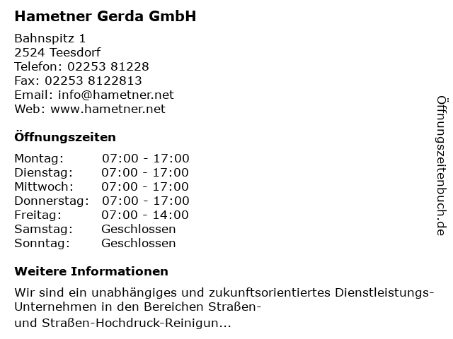 | Öffnungszeiten Hametner Gerda GmbH in Teesdorf anzeigen | |