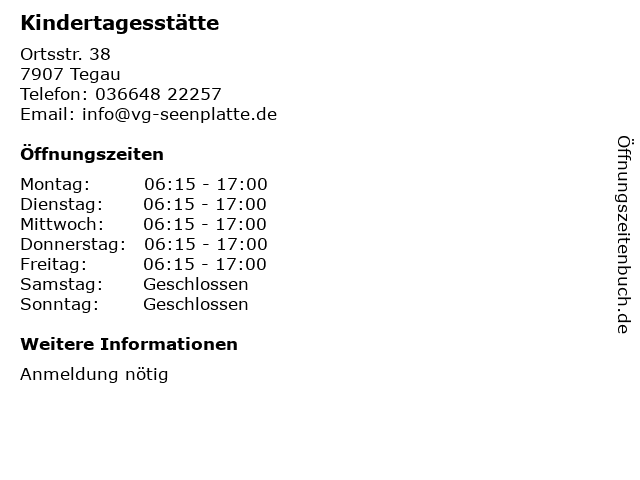 | Öffnungszeiten Kindertagesstätte in Tegau anzeigen | |