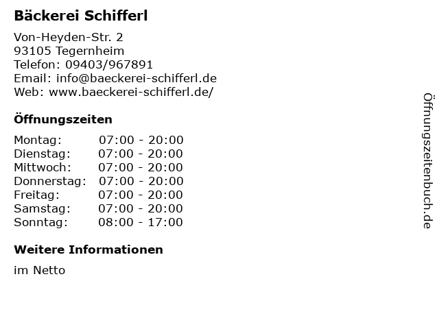 | Öffnungszeiten Bäckerei Schifferl in Tegernheim anzeigen | |