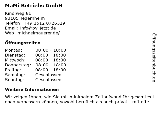 | Öffnungszeiten MaMi Betriebs GmbH in Tegernheim anzeigen | |