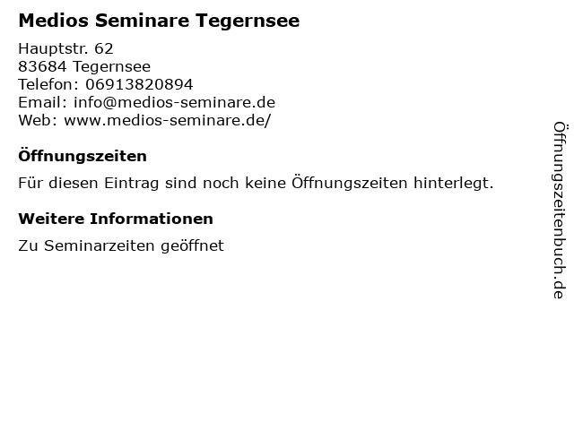 | Öffnungszeiten Medios Seminare Tegernsee in Tegernsee anzeigen | |