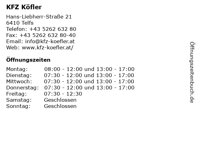 | Öffnungszeiten KFZ Köfler in Telfs anzeigen | |