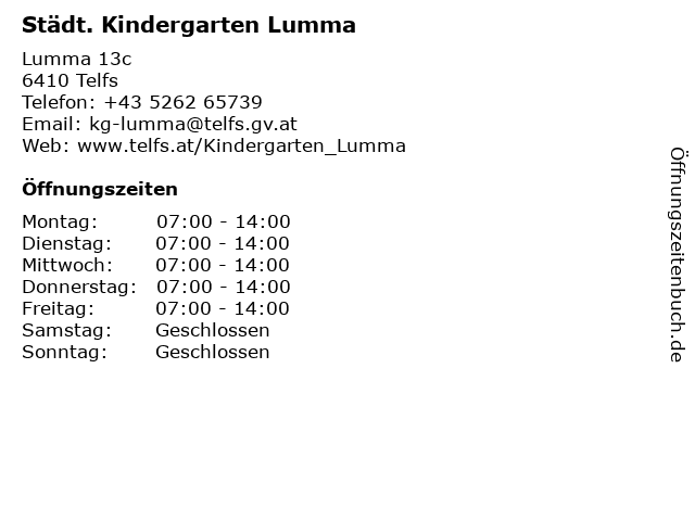 | Öffnungszeiten Städt. Kindergarten Lumma in Telfs anzeigen | |