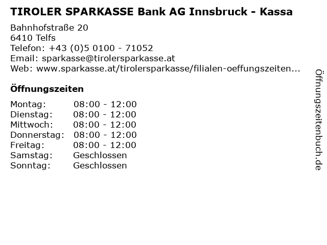 | 2 TIROLER SPARKASSE Bank AG Innsbruck - (Bankomat Filiale) (Entfernung: 0,27 km) Untermarktstraße 18, 6410 Telfs 3 TIROLER SPARKASSE Bank AG Innsbruck - Filiale Telfs (Kasse) (Entfernung: 0,27 km) Untermarktstraße 18, 6410 Telfs 4 TIROLER SPARKASSE Bank AG Innsbruck - Filiale Telfs (Beratung und Service) (Entfernung: 0,27 km) Untermarktstraße 18, 6410 Telfs 6 Tiroler Versicherung - Kundenbüro Telfs KFZ Anmeldung (Entfernung: 0,39 km) Anton-Auer-Straße 5, 6410 Telfs |