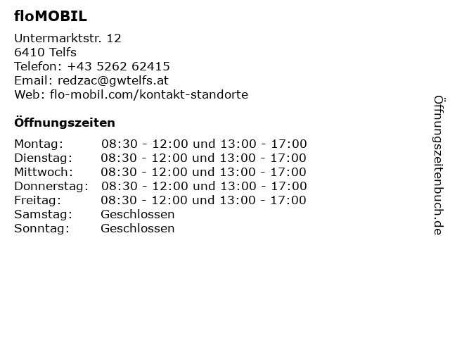 | Öffnungszeiten floMOBIL in Telfs anzeigen | |