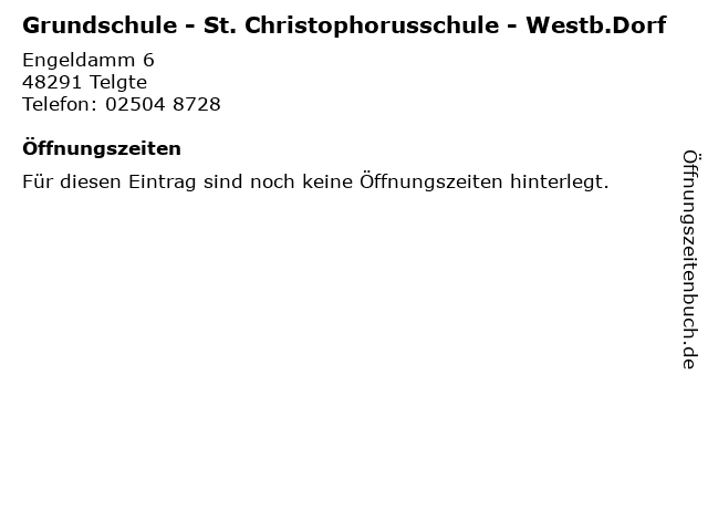 1 Grundschule - St. Christophorusschule - Westb.Vadrup (Entfernung: 2,19 km) Brinker Damm 33, 48291 Telgte 6 |
