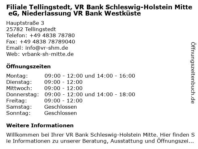 Branchen & Suchbegriffe zu Filiale Tellingstedt, VR Bank Schleswig-Holstein Mitte eG, Niederlassung VR Bank Westküste:bank, eg, holstein, mitte, niederlassung, tellingstedt, vr, westküste |