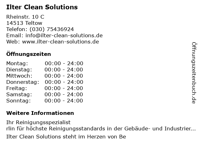 | Öffnungszeiten Ilter Clean Solutions in Teltow anzeigen | |