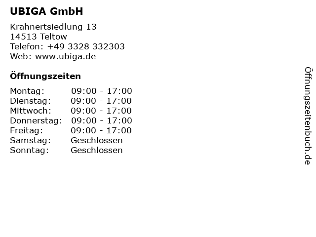 | Öffnungszeiten UBIGA GmbH in Teltow anzeigen | |