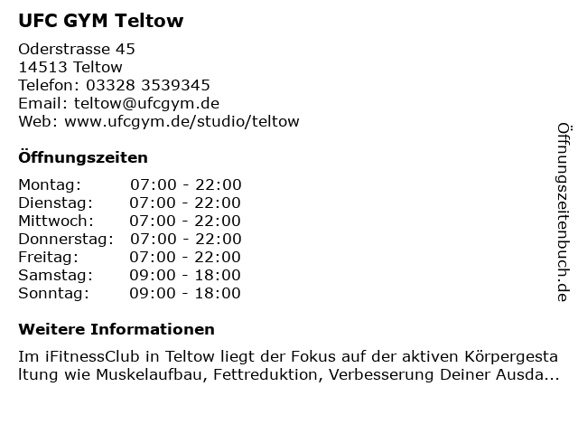 | Öffnungszeiten UFC GYM Teltow in Teltow anzeigen | |