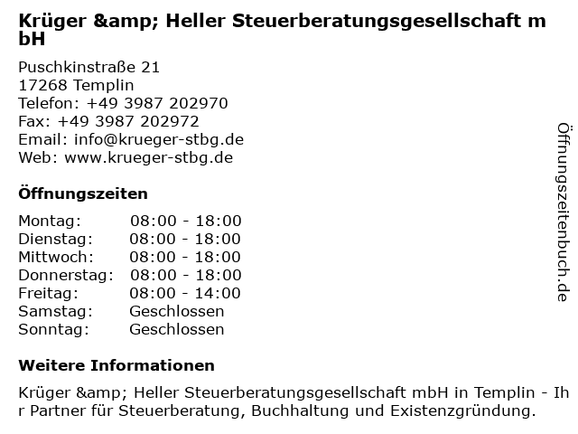1 Krüger & Heller Steuerberatungsgesellschaft GmbH (Entfernung: 0,01 km) Puschkinstr. 21, 17268 Templin 2 ETL Freund & Partner GmbH Steuerberatungsgesellschaft & Co. Templin und Zehdenick KG (Entfernung: 0,14 km) Bahnhofstraße 31, 17268 Templin 5 Schmidt & Partner GmbH Steuerberatungsgesellschaft (Entfernung: 0,97 km) Hindenburger Str. 2, 17268 Templin 6 |