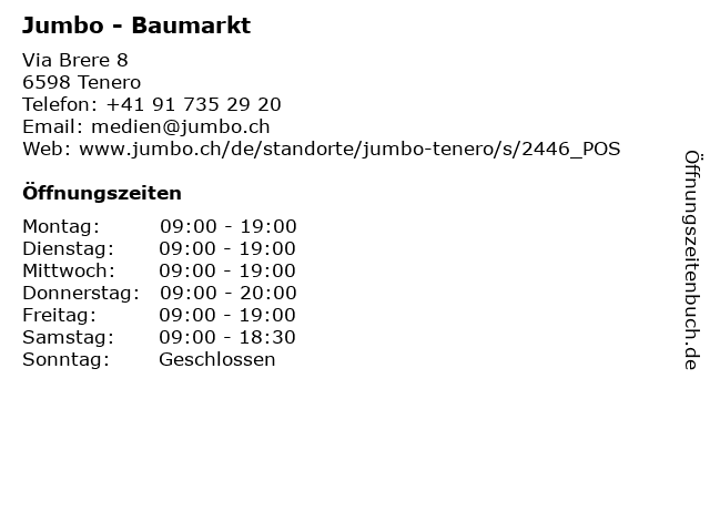 | Öffnungszeiten Jumbo - Baumarkt in Tenero anzeigen | |