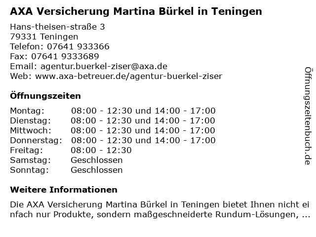 3 AXA Versicherung - Geschäftsstelle Martina Ziser (Entfernung: 4,80 km) Teninger Str. 38, 79353 Bahlingen 4 AXA Versicherung - Bezirksvertretung Andreas Rübsam (Entfernung: 5,21 km) Wälderstr. 16a, 79341 Kenzingen 6 |