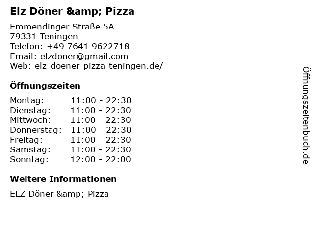 | Öffnungszeiten Elz Döner & Pizza in Teningen anzeigen | |