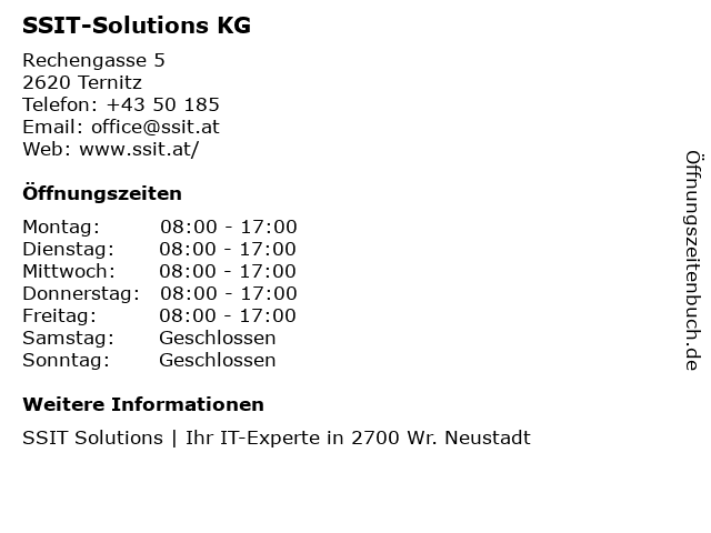| Öffnungszeiten SSIT-Solutions KG in Ternitz anzeigen | |