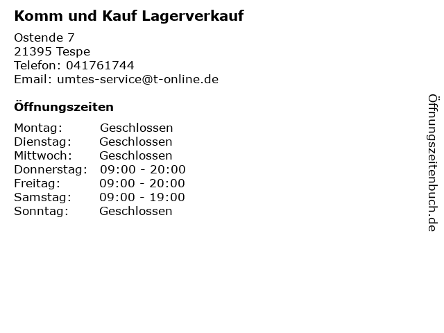 | Öffnungszeiten Komm und Kauf Lagerverkauf in Tespe anzeigen | |