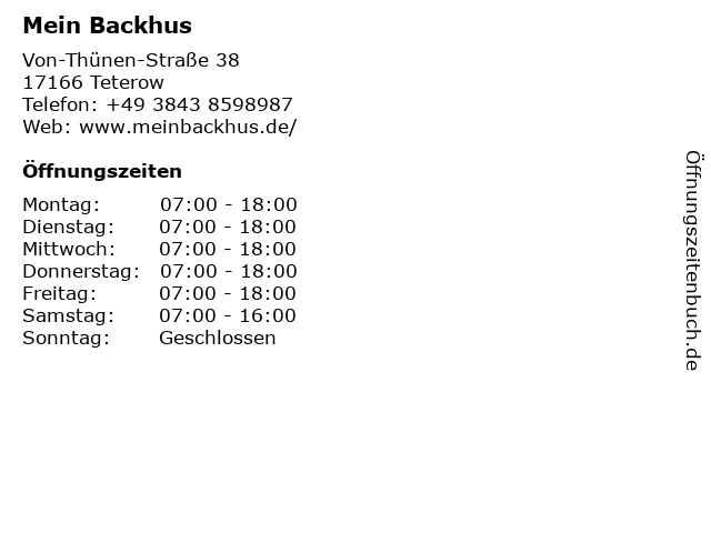 | Öffnungszeiten Mein Backhus in Teterow anzeigen | |