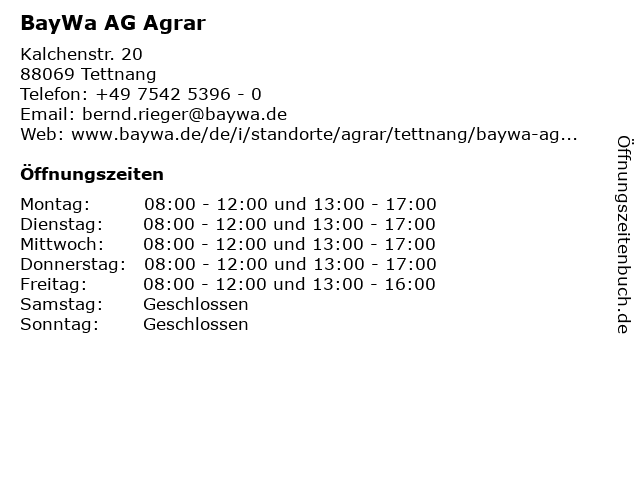 | Öffnungszeiten BayWa AG Agrar in Tettnang anzeigen | |