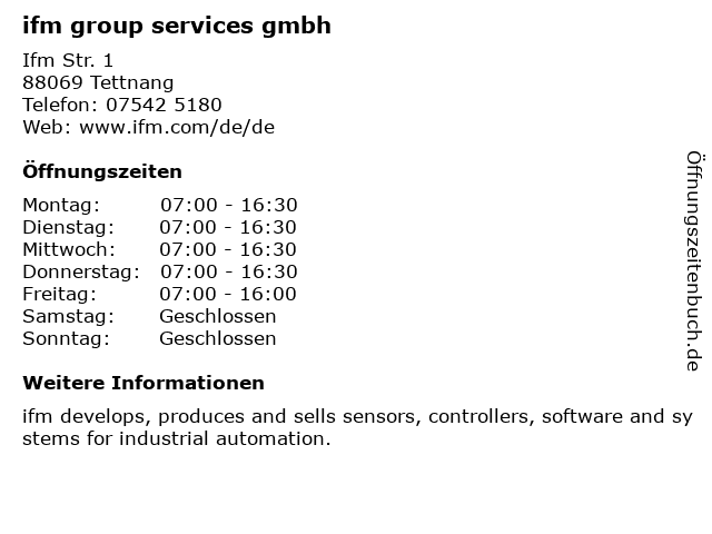 | Öffnungszeiten ifm group services gmbh in Tettnang anzeigen | |