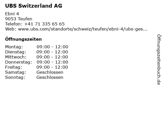 | Öffnungszeiten UBS Switzerland AG in Teufen anzeigen | |