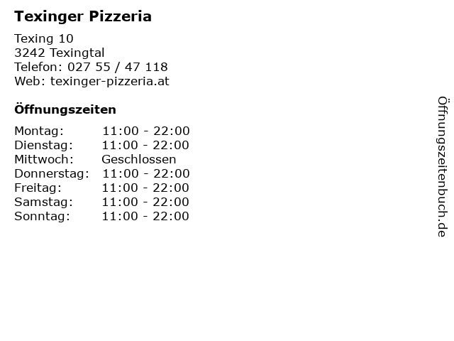| Öffnungszeiten Texinger Pizzeria in Texingtal anzeigen | |