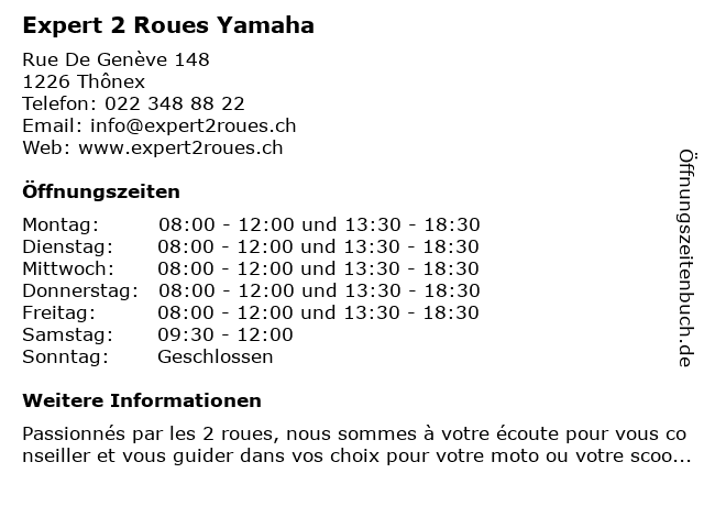 | Öffnungszeiten Expert 2 Roues Yamaha in Thônex anzeigen | |