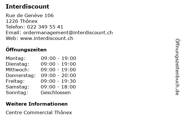 | Öffnungszeiten Interdiscount in Thônex anzeigen | |