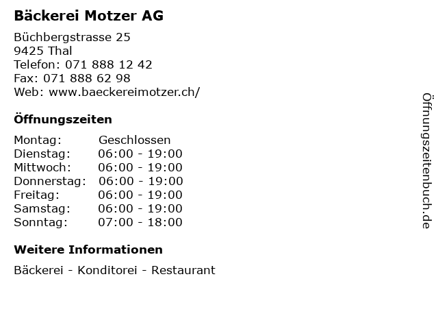 | Öffnungszeiten Bäckerei Motzer AG in Thal anzeigen | |