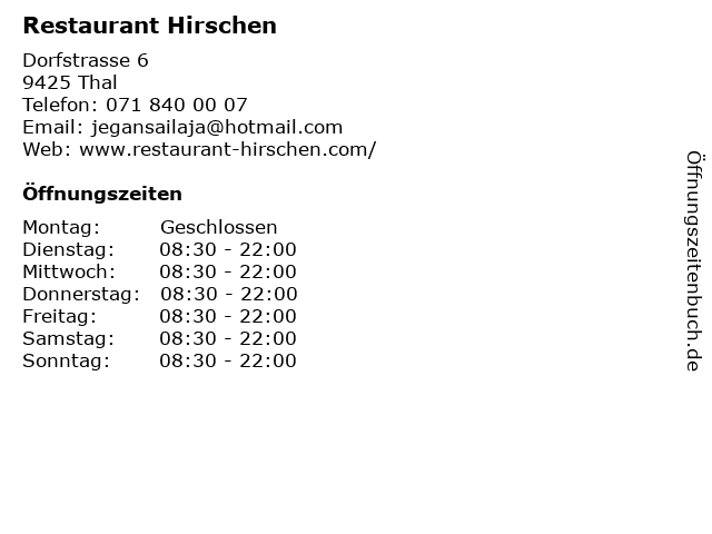 | Öffnungszeiten Restaurant Hirschen in Thal anzeigen | |