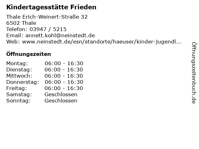 | Öffnungszeiten Kindertagesstätte Frieden in Thale anzeigen | |