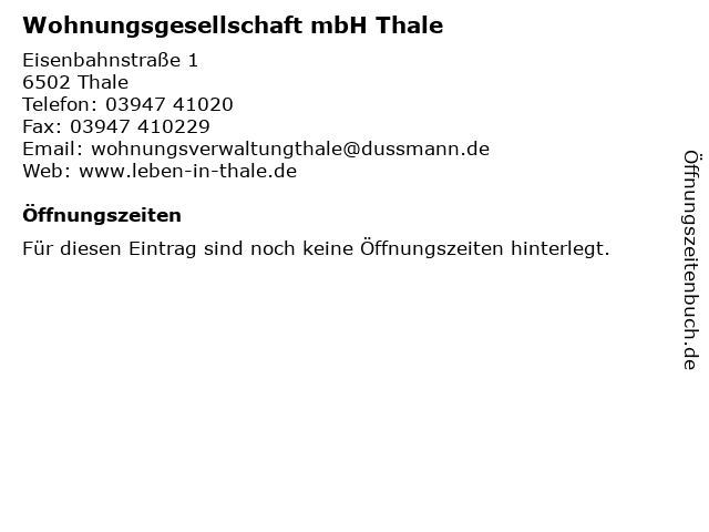 | Öffnungszeiten Wohnungsgesellschaft mbH Thale in Thale anzeigen | |