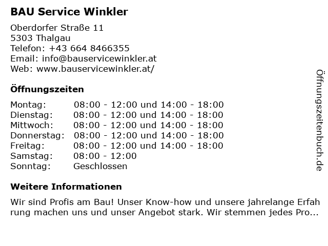 | Öffnungszeiten BAU Service Winkler in Thalgau anzeigen | |